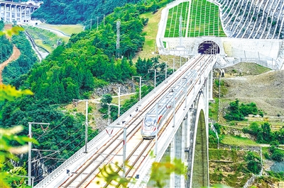 6月27日,首发高铁班列驶过渝厦高铁武隆黄草乌江特大桥(无人机照片)。 当日,新建重庆至厦门高速铁路(以下简称渝厦高铁)重庆东至黔江段开通运营,渝厦高铁重庆东至长沙段全线贯通,重庆至长沙最快3小时53分可达,旅行时间大幅压缩。 渝厦高铁是我国“八纵八横”高铁网的重要组成部分。此次重庆东至长沙段的全线贯通,在成渝地区双城经济圈与长株潭城市群间新增了一条快速客运通道,将极大便利沿线群众出行,对促进区域互联互通和经济社会协调发展,具有十分重要的意义。同日,西部地区最大高铁枢纽站重庆东站也同时投入使用。 (新华社发 张凯 摄)