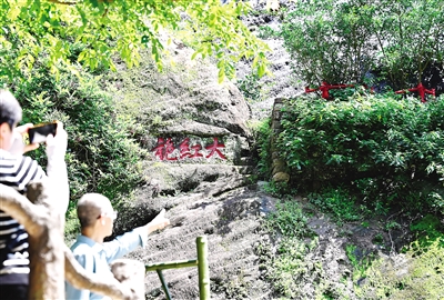 6月25日,游客参观生长在武夷山九龙窠高岩峭壁上的大红袍茶树母株。