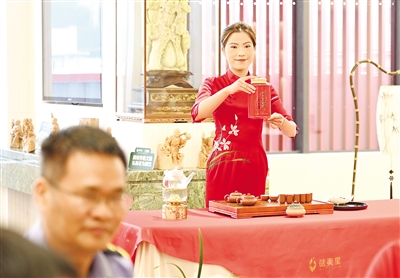 6月25日,武夷山市武夷星茶业有限公司工作人员为游客展示茶艺。