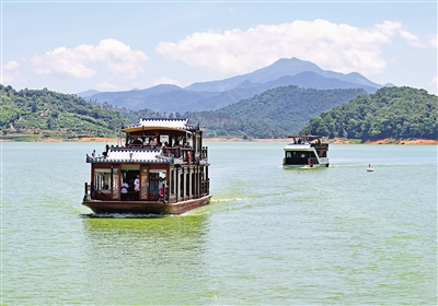 6月26日,游客在宁德市古田县的国家4A级旅游景区翠屏湖上乘坐游船观光。
