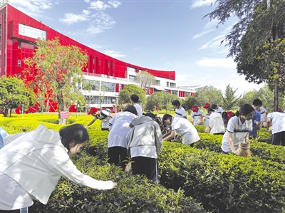 随着暑期来临,研学游热潮涌动,武夷山推出多元化研学游产品,出台针对学生群体、研学团队的优惠政策,受到众多游人青睐,许多省内外学校也纷纷组织学生前来开展主题多样的研学活动。 图为6月26日,福州市长乐第二中学600余名师生开展“品研茶韵味·悟理学精髓”研学实践活动,研学团走进武夷星茶树种质资源圃和茶科技展厅,体验武夷岩茶采摘制作,感受武夷茶文化魅力。 (张筱惜 林怡然 摄)