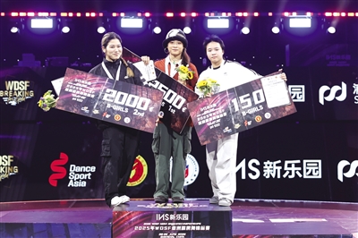 6月29日,女子组冠军中国选手郭朴(中)、亚军日本选手津波古里科(左)、季军中国选手刘清漪在女子组颁奖仪式上合影。 当日,2025年亚洲霹雳舞锦标赛在上海卢湾体育馆落幕。(新华社记者 王翔 摄)