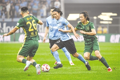 6月30日,大连英博海发队球员廖锦涛(前中)在比赛中带球突破。 当日,在辽宁大连举行的2025赛季中国足球超级联赛第16轮比赛中,大连英博海发队主场1比0战胜浙江俱乐部绿城队。 (新华社记者 潘昱龙 摄)