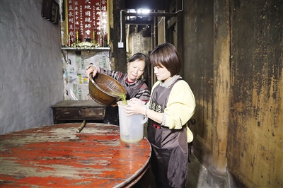 许多光泽人爱喝擂茶,李静也不例外。为了更好地传播擂茶文化,李静将擂茶制作成饮品,放到店里冷藏售卖,很受顾客欢迎。她制作擂茶时用的是万家传承至今的传统擂钵工具,原料选用光泽当地上好茶叶,按一定比例加入大米、大豆、花生、芝麻、甘草、菊花、艾叶等中草药。她还根据食品安全要求,专门设计饮料瓶,标注生产日期,确保饮用安全。2023年,光泽擂茶制作技艺列入南平市第十批非物质文化遗产项目名录。2024年,南平市第八批非物质文化遗产项目代表性传承人公布,李静作为光泽擂茶制作技艺代表性传承人入选名单。