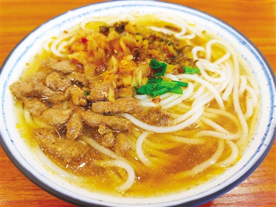 每天一大早,在光泽县城区,“万婆婆”小吃店就已热气蒸腾。“泡粉来一碗,还要一杯擂茶。”“酸菜多加一点!”老板和顾客一来一回的应答中,独具光泽特色的烟火味弥漫开来。