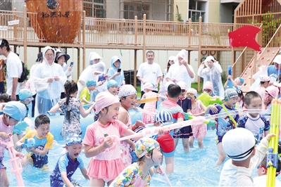 近期,松溪县实验幼儿园开展闭园活动。活动以“安全玩水,快乐度夏”为主题,通过“打水仗”大游戏、安全谈话等环节,让孩子们释放爱玩水的天性,同时对幼儿进行防溺水教育。图为孩子们在教师、家长们的看护下尽情玩乐。(吴鹏 摄)