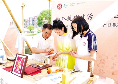 近日,由邵武市文体旅局主办的“融入现代生活,非遗正青春”2025年暑期非遗集市活动举行,碎铜茶制作技艺、邵武竹编技艺等十余项非遗项目集中亮相,吸引不少市民和游客沉浸式感受传统文化的魅力。图为游客体验非遗拓印。 (王晓云 摄)