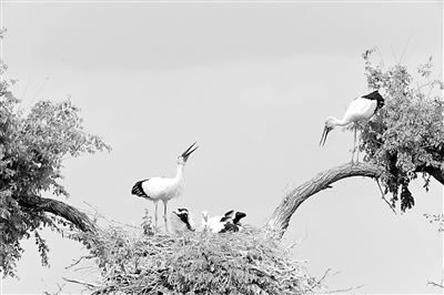 在黑龙江扎龙国家级自然保护区克钦湖,东方白鹳一家在巢上活动(6月9日摄)。 东方白鹳是国家一级保护动物,被誉为“鸟中国宝”。每年春天,它们会从长江中下游的越冬地,跨越千里回到东北的繁殖地繁衍生息。 (新华社发 王勇刚 摄)