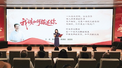 “我该如何描述你,我从未见过你/我从一朵玉兰花上,捕捉你的气息/我想象那是你……他们说,这是你热爱的土地/你用坚实的脚步丈量过,村庄和田野……”第一个登场的黄勇英朗诵的是自己创作的诗歌《我该如何描述你》。“读了关于廖俊波的一些纪实类文章,我被他在工作中表现出来的顾全大局、无私奉献、热爱人民、廉洁奉公的精神深深打动,于是想为他写两首诗,表达心中对他的敬仰之情。”谈及创作诗歌的过程,黄勇英表示,在她看来,廖俊波同志苦干实干、心系群众,他的英年早逝令人痛心,政和的百姓思念他,不舍他的离去,她想通过诗歌来表现群众对他怀念的深情。同时,她创作诗歌时正值春季,因此她借用了一些美好的、蓬勃向上的春天诗歌意象,将对廖俊波同志的怀念之情呈现出来。“虽然他永远离开了我们,但我希望他能够‘借一朵花的眼睛/凝视,这欣欣向荣的大地’,从这层含义上来说,他就好像并没有离去,他借助一个春天,永远地活了下来。”黄勇英说。