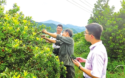 农行建阳支行工作人员走访杨梅种植户,了解资金需求。 (黄炜航 摄)