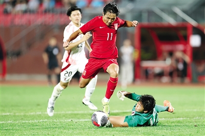 7月4日,中国队球员帅惟浩(上)在比赛中带球突破。 当日,在沈阳举行的2025CFA中国之队·沈阳“和平杯”国际足球锦标赛中,中国U16男足1比1战平日本U16男足。 (新华社记者 李钢 摄)