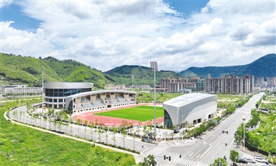 这是7月4日拍摄的政和县廖俊波体育中心建设项目现场。该项目位于政和城区南门片区,总投资2.7亿元,是一个以体育运动为主,集健身培训、餐饮住宿、休闲娱乐等功能于一体的城市体育综合体。项目分二期建设,目前一期工程已进入收尾阶段,预计9月投入使用。 (郭斯杰 阮倩敏 摄)