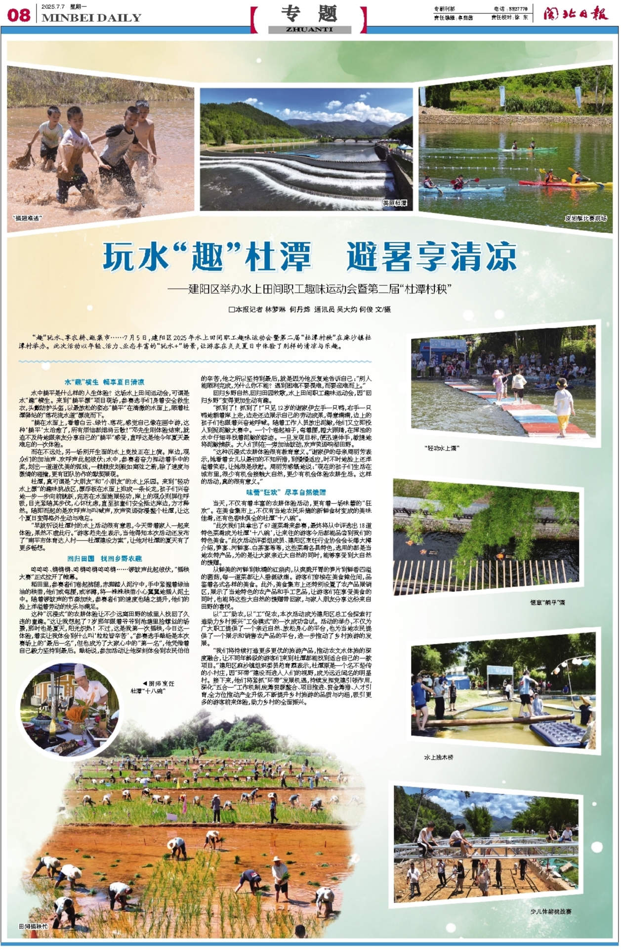 “趣”玩水、享农耕、逛集市……7月5日,建阳区2025年水上田间职工趣味运动会暨第二届“杜潭村秧”在麻沙镇杜潭村举办。此次活动以年轻、活力、业态丰富的“玩水+”场景,让游客在炎炎夏日中体验了别样的清凉与乐趣。