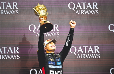 7月6日,冠军迈凯伦车队英国车手诺里斯在颁奖仪式上庆祝。 当日,在2025赛季世界一级方程式赛车锦标赛(F1)英国大奖赛正赛在银石赛道举行。迈凯轮车队的英国车手诺里斯凭借对手的失误和自己稳定的发挥,夺得冠军。 此战获胜后,诺里斯的年度积分升至226分,在车手积分榜上只落后榜首的队友皮亚斯特里8分。由于排名第三的红牛车手维斯塔潘积分只有165分,如无意外,本赛季车手总冠军将在两名迈凯轮车手中间产生。 (新华社记者 李颖 摄)