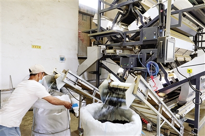 近日,武夷山市桃渊茗茶叶科学研究所有限公司的员工利用新一代色选机在拣剔茶叶。 近年来,武夷山市有一定规模的茶企都购置色选机,还有专门的色选厂,新一代色选机既省时又省工,色选质量又高,降低了人力成本。 (裴礼辉 邱汝泉 摄)