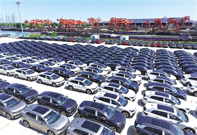 这是京杭大运河杭州段一出口汽车码头上等待出口的新能源汽车(6月29日摄,无人机照片)。 7月10日,中国汽车工业协会发布的数据显示,2025年上半年我国汽车产销量首次双超1500万辆,均同比实现两位数增长,汽车产业活力持续释放。 (新华社发 龙巍 摄)