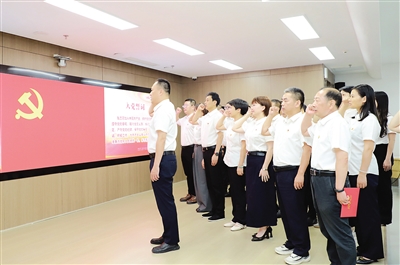 3日,农行南平分行机关党委开展庆“七一”主题党日活动。图为参加本次活动的党员面向鲜红的党旗,庄严举起右拳,重温入党誓词。 (刘木香 摄)