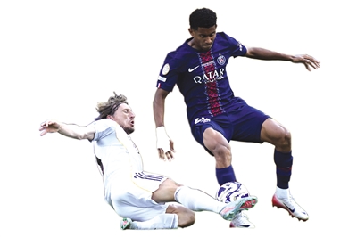 7月9日,皇家马德里队球员莫德里奇(左)铲断巴黎圣日耳曼队球员马尤卢的球。这是莫德里奇效力皇马的最后一场比赛,他即将转会至意大利AC米兰队。 (新华社记者 李睿 摄)