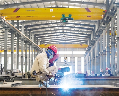 8日,位于建阳经济开发区徐市片区的鑫众信钢结构工程有限公司生产车间里,工人在焊接钢构配件。该公司是一家集生产、贸易、加工钢结构等配件为一体的技术型企业,去年,企业入选福建省装配式钢结构生产基地名单,目前企业订单已经排到2026年上半年。 (张行健 陈颖 徐园园 摄)