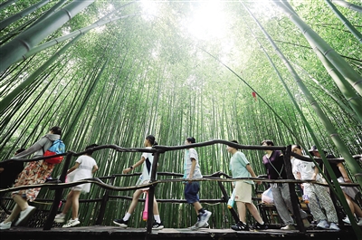 7月13日,在山东省临沂市沂南县铜井镇竹泉村,游客在竹林中避暑纳凉。