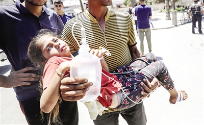7月13日,在加沙城一所医院,一名男子怀抱在以军空袭中受伤的女孩。