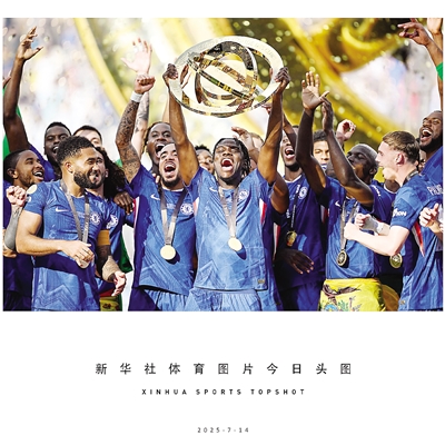 7月13日,切尔西队球员在颁奖仪式上捧起世俱杯奖杯。