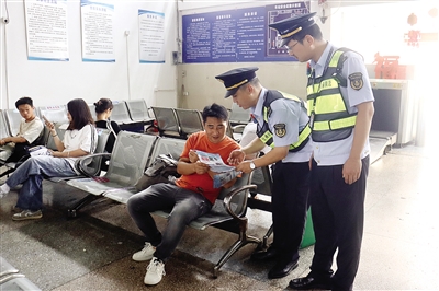 为保障广大乘客暑期出行安全,7月17日,南平高速执法支队五大队到松溪汽车站开展以“安全出行,拒绝黑车”为主题的宣传活动。图为执法人员在候车厅向乘客讲解乘坐“黑车”可能面临的风险。 (周思晨 摄)