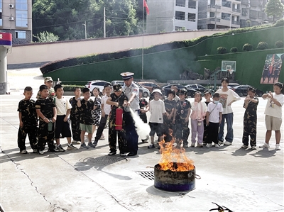 7月15日,政和县总工会组织师生到政和县源峰庄消防救援站零距离体验消防生活,宣传员带领小朋友们参观了营区环境、执勤车辆、个人防护装备、消防器材,并详细介绍了各种车辆、装备的性能、功能及用途。图为小朋友们在消防救援人员指导下体验油盆灭火。 (黄烨铭 摄)