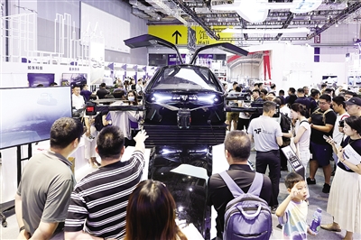 7月23日,观众在博览会现场了解一款飞行汽车。