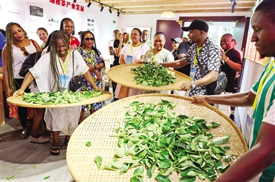 7月20日,赤道几内亚外交业务培训研修班学员一行30多人,来到武夷山三茶融合发展体验中心体验武夷岩茶制茶技艺。这也是赤道几内亚外交业务培训研修班学员首次来到武夷山体验武夷岩茶制茶技艺。 (裴礼辉 邱汝泉 摄)