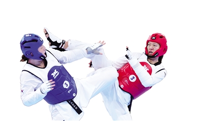 7月23日,中国队选手穆文喆(右)在比赛中。 当日,在德国埃森举行的2025年莱茵-鲁尔世界大学生夏季运动会跆拳道女子团体决赛中,由穆文喆、邢佳妮和郭清组成的中国队战胜韩国队,获得金牌。 (新华社记者 李颖 摄)
