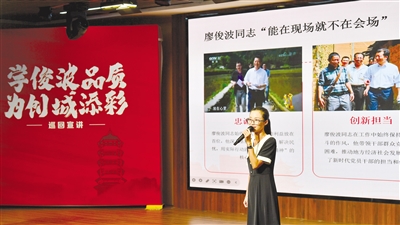 24日,建瓯市举行“学俊波品质,为创城添彩”宣讲会。8位宣讲员结合自身实践,讲述了各自在岗位中践行廖俊波品质、主动担当作为的故事,展现出干事创业的热情, 凝聚了学习先进、共创文明的共识。图为宣讲员在进行主题宣讲。 (吴震 罗光耀 摄)