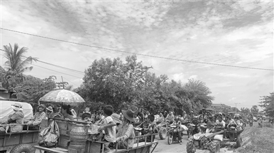 这是7月24日拍摄的柬埔寨奥多棉吉省边境地区正在撤离的民众。 柬埔寨参议院主席洪森24日在社交媒体上说,柬埔寨奥多棉吉省和柏威夏省的边境地区遭到泰国炮击。洪森敦促民众不要恐慌,不要囤积商品,并呼吁商家不要提高商品价格。 (新华社发 帕尔林 摄)