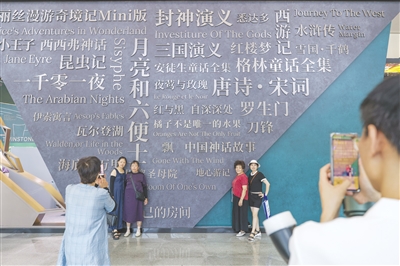 7月25日,参观者在第三十三届全国图书交易博览会现场拍照。 当日,由国家新闻出版署主办、重庆市人民政府承办的第三十三届全国图书交易博览会(下称“书博会”)在重庆开幕,线上线下汇集精品图书上百万种,其中新书约10万种。本届书博会以“书香中国 阅读之美”为主题,主会场设在重庆国际博览中心,同时在重庆市南岸区、大足区设分会场。展会期间,来自全国各省区市的1000多家出版印刷发行单位参展,推送优质出版内容,推动读者、作者深度互动,营造全社会爱读书、读好书、善读书的浓厚氛围。据悉,本届书博会将持续至7月28日,面向读者免费开放。 (新华社记者 陈诚 摄)
