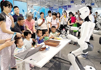 7月28日,参观者在机器人6S店与机器人互动。 当日,全球首家机器人6S店在深圳市龙岗区的机器人剧场开业,该店采用“六位一体”模式,整合了销售、零配件、售后服务、信息反馈、租赁、个性化定制六大功能,为机器人从实验室走向市场、从技术概念走向生活场景搭建了桥梁。 (新华社发 张子娴 摄)