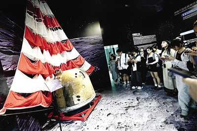 7月31日拍摄的展出的嫦娥六号返回舱。 当日,由国家航天局与香港特别行政区政府联合主办的“无尽探索:中国的航天、航空及航海”展览在香港科学馆开幕。 本次展览是中国国家航天局首次在境外举办的涵盖航天、航空、航海三个领域的展览。多项展品首次在港亮相,包括嫦娥五号带回的月球正面样品与嫦娥六号带回的人类首份月球背面样品,“20家族”的歼-20、运-20、直-20等飞机模型,山东舰航空母舰、“爱达·魔都号”大型邮轮、大型液化天然气(LNG)运输船等造船业皇冠上的“三颗明珠”模型等亮点展品将集中对公众展示。(新华社发 吕小炜 摄)