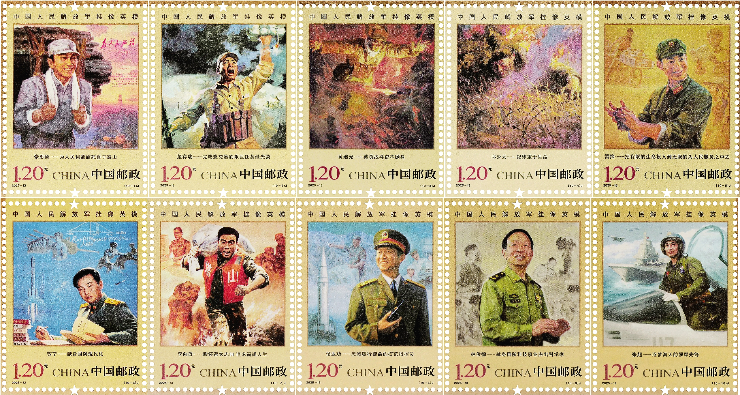中国邮政于2025年8月1日发行《中国人民解放军挂像英模》纪念邮票1套10枚,邮票图案名称为:张思德、董存瑞、黄继光、邱少云、雷锋、苏宁、李向群、杨业功、林俊德、张超。全套邮票面值12元,计划发行数量450万套。
