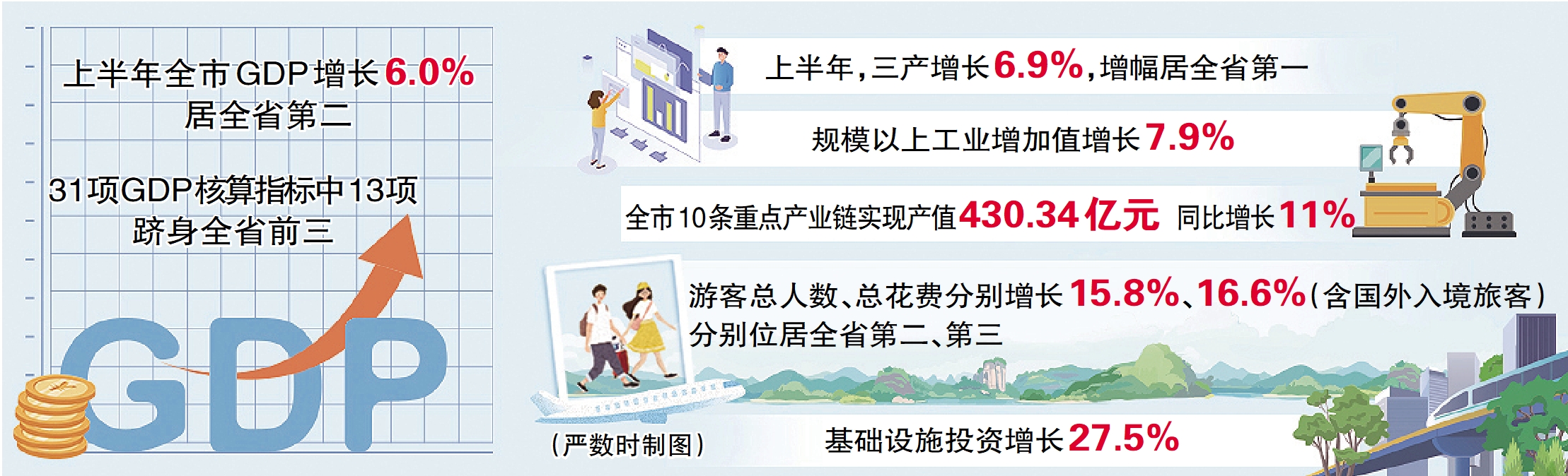 上半年,规模以上工业增加值增长7.9%。全市10条重点产业链实现产值430.34亿元,同比增长11%;全市大力举办“迎宾客引人流,促消费促发展”活动,带动游客总人数、总花费分别增长15.8%、16.6%(含国外入境旅客),分别位居全省第2、第3;全市固定资产投资同比增长6.0%,其中,基础设施投资表现亮眼,增长27.5%。496项省市重点项目完成投资299.41亿元,占年度计划的53.68%,超序时进度3.68个百分点。