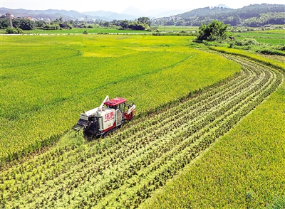 8月1日,收割机在建阳区徐市镇再生稻种植大户冯荣贵的稻田里来回穿梭。冯荣贵种植了1200多亩再生稻,现已成熟。据了解,今年徐市镇共种植再生稻8000亩,目前陆续开始收割。 (张行健 徐园园 摄)