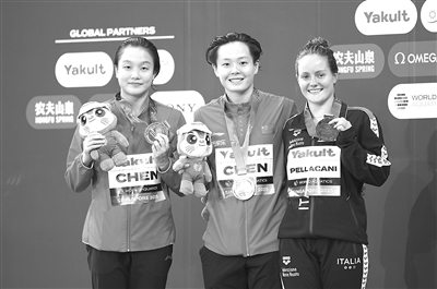 当日,在新加坡举行的2025年世界游泳锦标赛跳水女子3米板决赛中,中国选手陈艺文、陈佳包揽冠亚军。
