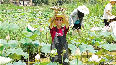 7月15日,上梅乡里举办的“荷塘摸鱼采莲体验行”活动,则让这片荷塘“鲜活”起来。锣声一响,早已跃跃欲试的人们卷起裤腿,跃入清凉的荷塘。刹那间水花四溅,一场激烈的“人鱼追逐战”火热上演。