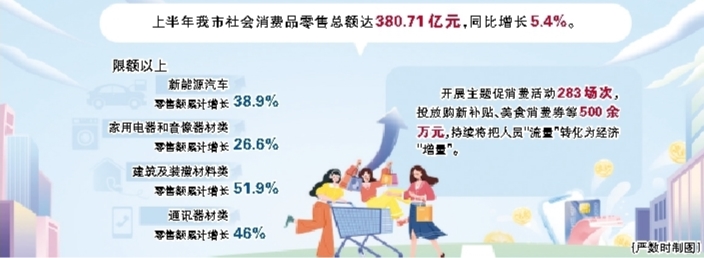 本报讯(记者 郑可 通讯员 上官浩源)2025年上半年,我市通过政策引领、场景创新、品牌升级等措施,持续激发消费市场活力。1日,记者从市商务局获悉,上半年我市社会消费品零售总额达380.71亿元,同比增长5.4%。