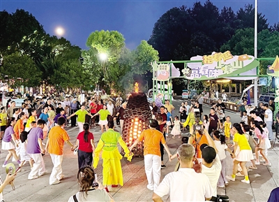 8日晚,非遗民俗剧场前,武夷茶舞的轻快旋律漫过人群,游客与村民手拉手围成圈,踩着鼓点起落的舞步里,衣角在火光中翻飞,掌心相触的温度里,唱跳声与笑声在夜色里层层漾开。