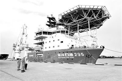8月8日,在文莱摩拉港码头,工作人员站在“海洋石油295”船前。 当日,由中国自主设计建造的多功能特种作业船——“海洋石油295”船首次来到文莱参与项目作业。 (新华社记者 李萌 摄)