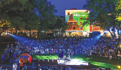 “崇安百姓大舞台”位于历史悠久的西林庙旧址旁。夜色降临,周边群众闻讯而来,青石板铺就的广场上人头攒动。在欢快的架子鼓声中,《鼓舞中国》《十年》《晴天》等歌曲和舞蹈轮番上演,人群中不时传出阵阵掌声。