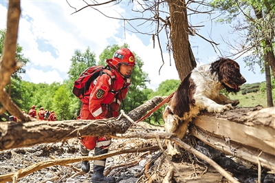 8月11日,武警甘肃总队机动支队官兵在兰州市榆中县马莲滩村带领搜救犬搜寻失联人员。 当日,武警甘肃总队继续投入400余名兵力在兰州市榆中县兴隆山村、马莲滩村、小康营村等地开展失联人员搜寻、居民区清淤、物资转移、医疗巡诊等任务。 (新华社发 侯崇慧 摄)