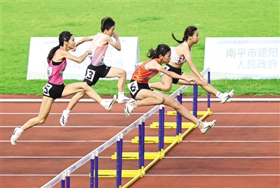 11日,由福建省体育局、福建省教育厅主办的2025年福建省青少年田径冠军赛暨中学生联赛在南平市体育中心开赛,来自省内148所学校的近900名运动员参加比赛,比赛将持续至14日。图为女子初中组100米栏决赛现场。 (张行健 摄)