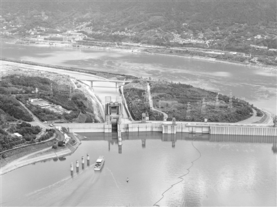 8月16日,在湖北省宜昌市,游轮长江三峡5号驶向三峡升船机(无人机照片)。 8月15日13时许,随着西陵峡“和谐号”游轮缓缓进入承船厢靠泊并顺利通过三峡大坝,世界最大“船舶电梯”——三峡升船机累计客运量突破200万人次。 (新华社发 王辉富 摄)