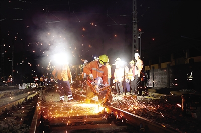 “开始作业!”日前,在鹰厦铁路来舟站Ⅱ场南端,随着国铁南昌局南平工务段邵武综合机修车间主任丁振龙一声令下,120余名作业人员迅速上道,进行成组更换道岔施工。拆除废旧道岔和轨料、平整道床、铺设石砟……4个小时后,换岔终于圆满完成。