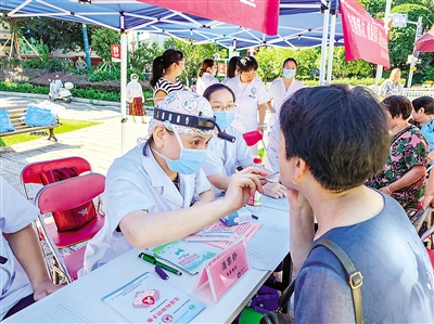 8月19日是第八个中国医师节。连日来,武夷山公立总医院组织心血管内科、神经内科、呼吸与危重症医学科、普外科等多学科专家团队,赴社区及乡镇开展义诊活动,将优质医疗资源送到居民家门口。图为义诊现场。 (林李冰 王鹏靖 摄)